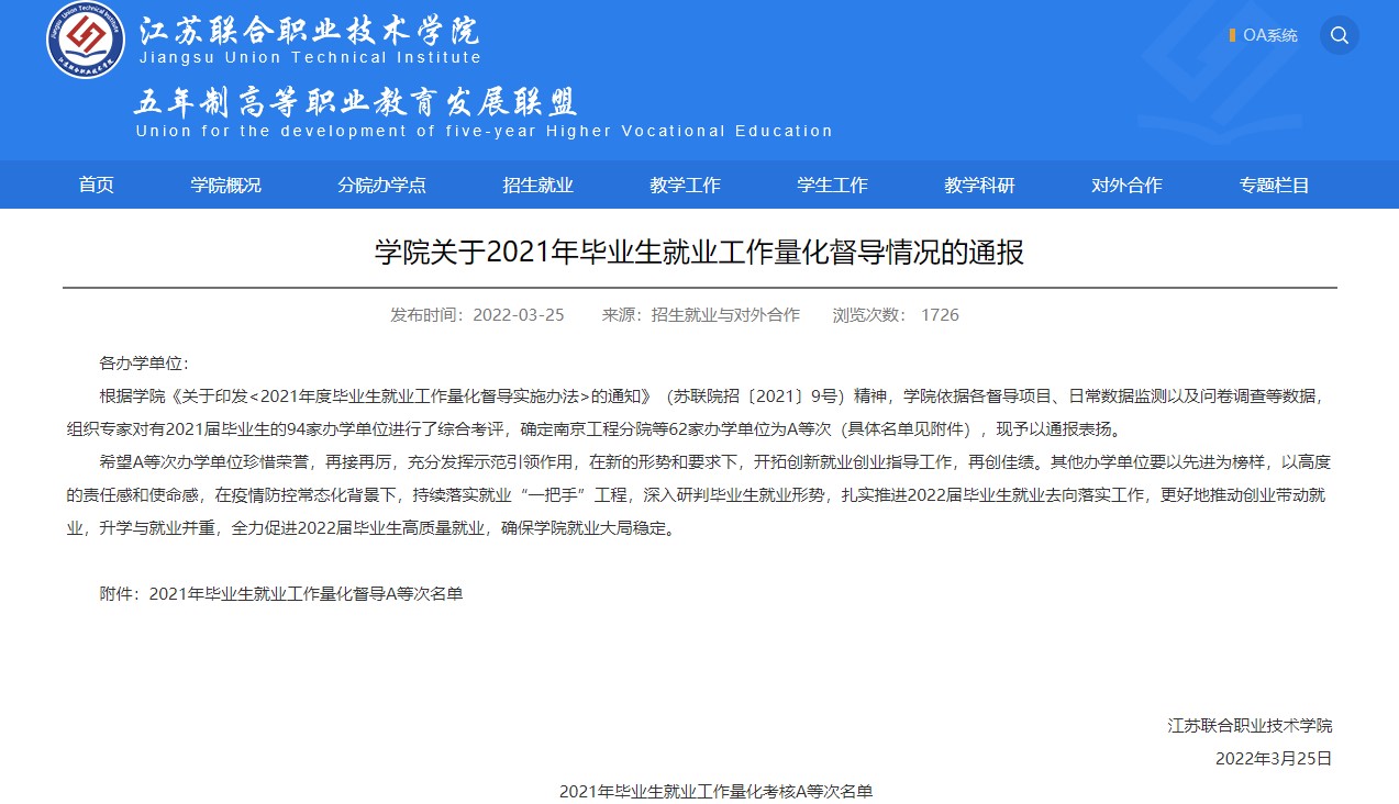 据江苏联合职业技术学院官网发布的《学院关于2021年毕业生就业工作量化督导情况的通报》,相城中专获得2021年毕业生就业工作量化督导A等次。这是我校继2020年被评为毕业生就业工作量化考核A等次办学单位后又一次获得此项荣誉。