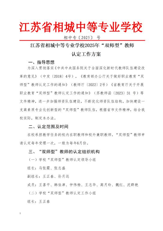 江苏省相城中等专业学校2025年“双师型”教师认定工作方案