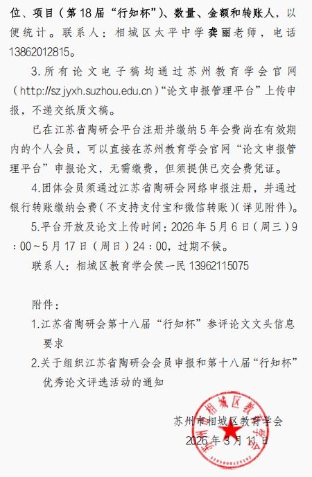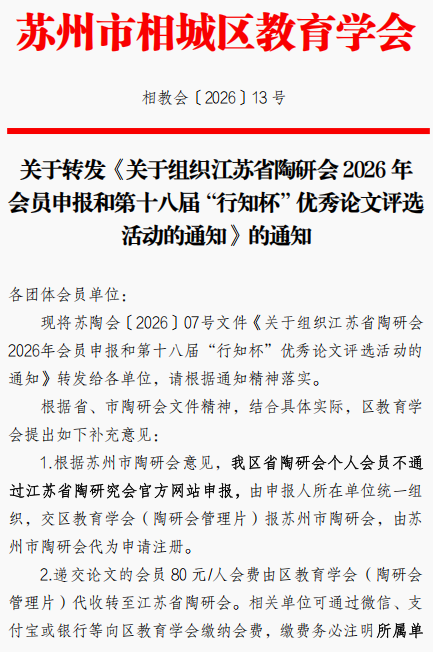 关于转发《关于组织江苏省陶研会 2026 年会员申报和第十八届“行知杯”优秀论文评选》的通知